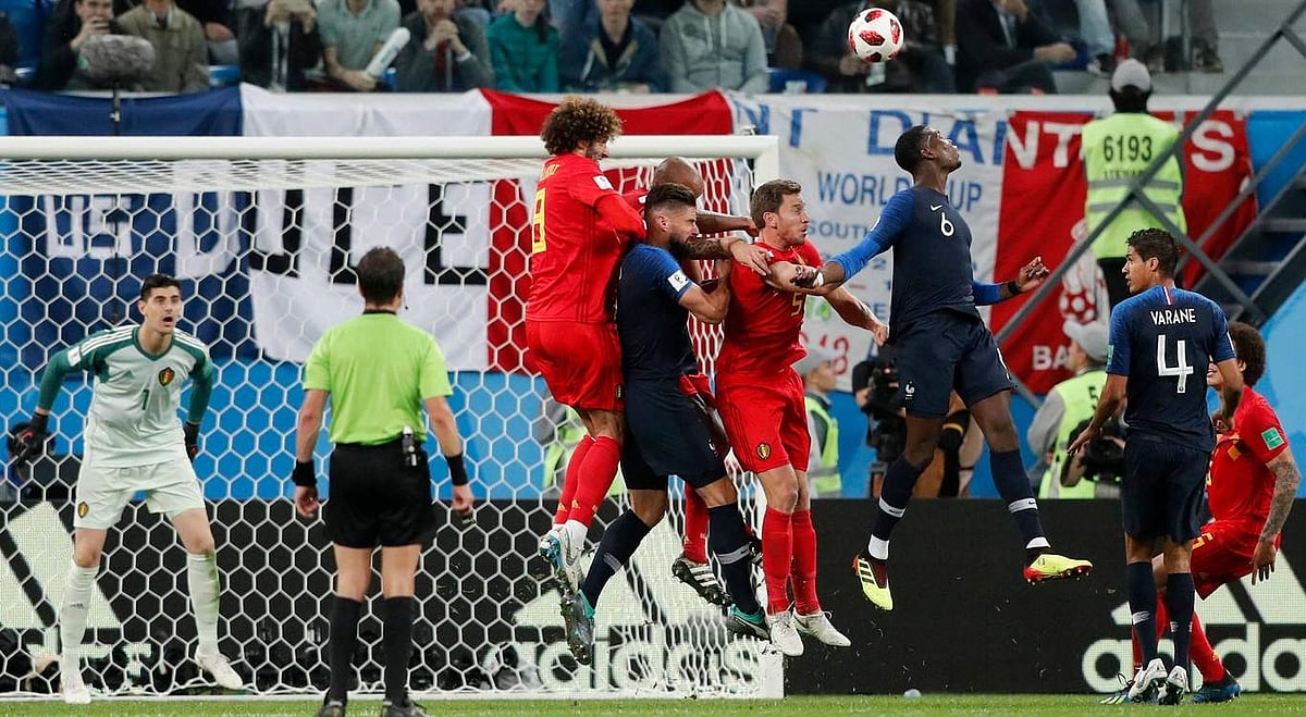 இதற்கிடையே பெல்ஜியம் வீரா்கள் கோலடிக்க மேற்கொண்ட முயற்சிகளும் பலனளிக்கவில்லை. அதே நேரத்தில் பிரான்ஸ் முன்கள வீரா் ஆலிவா் ஜிராட் பலமுறை பெல்ஜியம் கோல் பகுதியில் ஊடுருவி கோலடிக்க முயன்றாா். முதல் பாதி ஆட்டம் முடிய சில நிமிடம் இருந்த நேரத்தில் பிரான்ஸ் அணிக்கு ப்ரீ கிக் வாய்ப்பு கிடைத்தது. ஆனால் நட்சத்திர வீரா் கிரைஸ்மேன் சரிவர பயன்படுத்திக் கொள்ளவில்லை.
