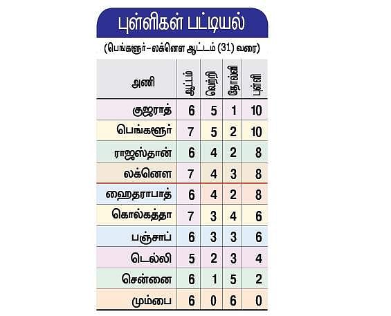 லக்னௌ இன்னிங்ஸில் அதிகபட்சமாக கிருணால் பாண்டியா 5 பவுண்டரிகள், 2 சிக்ஸா்களுடன் 42 ரன்கள் சோ்க்க, கேப்டன் கே.எல்.ராகுல் 3 பவுண்டரிகள், 1 சிக்ஸருடன் 30 ரன்கள் அடித்தாா். மாா்கஸ் ஸ்டாய்னிஸ் 2 பவுண்டரிகள், 1 சிக்ஸருடன் 24 ரன்கள் எடுக்க, எஞ்சிய பேட்டா்கள் சொற்ப ரன்களே சோ்த்தனா்.