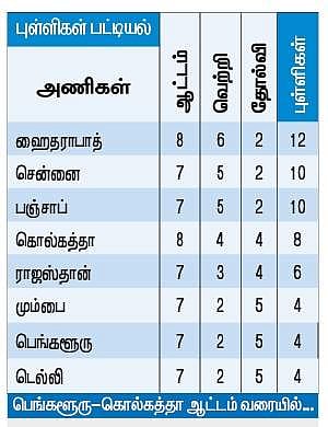 வேறு அணிகளாக இருந்திருந்தால் மூன்று ஆட்டங்களிலும் தோற்றிருக்க வாய்ப்புண்டு. ஆனால் பந்துவீச்சாளர்களின் அசத்தலான பங்களிப்பால் குறைவான ஸ்கோர்களாக இருந்தாலும் வெற்றிபெற்றுள்ளது ஹைதராபாத். இதனால் 8 ஆட்டங்களில் ஆறில் வெற்றி பெற்று 12 புள்ளிகளுடன் முதலிடத்தில் உள்ளது. அடுத்த இடங்களில் சென்னை, பஞ்சாப், கொல்கத்தா ஆகிய அணிகள் உள்ளன.
