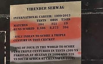 எனினும் இந்த நுழைவாயிலில் உள்ள பலகையில் சேவாக்கின் பெருமைக் குறிப்புகள் இடம்பெற்றுள்ளன. அதில் முச்சதம் அடித்த ஒரே இந்தியர் என எழுதப்பட்டுள்ளது. கடந்த டிசம்பரில் சென்னையில் நடைபெற்ற இங்கிலாந்துக்கு எதிரான டெஸ்ட் போட்டியில் கருண் நாயர் முச்சதம் அடித்து அசத்தினார். இந்நிலையில் சேவாக்கை மட்டும் முச்சதம் அடித்த ஒரே இந்தியர் என்று தகவல் பிழையுடன் குறிப்புகள் இடம்பெற்றுள்ளன. இதனால் தில்லி கிரிக்கெட் சங்கத்த்தின் மீது விமரிசனங்கள் எழுந்துள்ளன.