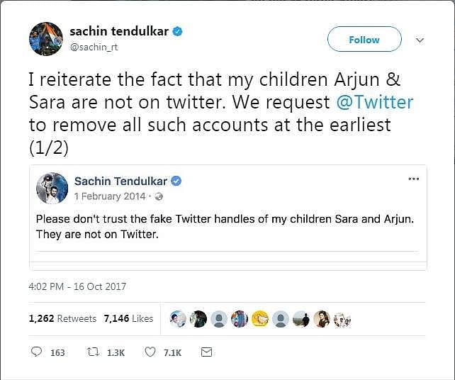 எனது வாரிசுகள் அர்ஜுன் மற்றும் சாரா பெயரில் செயல்படும் போலி டிவிட்டர் கணக்குகளை உடனடியாக நீக்குங்கள் என்று பிரபல சமூக வலைத்தளமான டிவிட்டருக்கு, சச்சின் டெண்டுல்கர் மீண்டும் வேண்டுகோள் வைத்துள்ளார்.