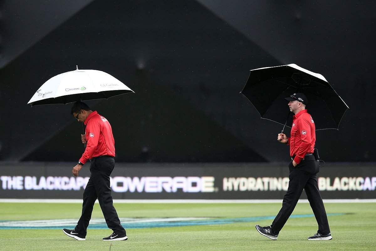 டிஎல்எஸ் முறையில் 61 ரன்கள் வித்தியாசத்தில் நியூஸிலாந்து அணி வெற்றி பெற்றதாக அறிவிக்கப்பட்டது...