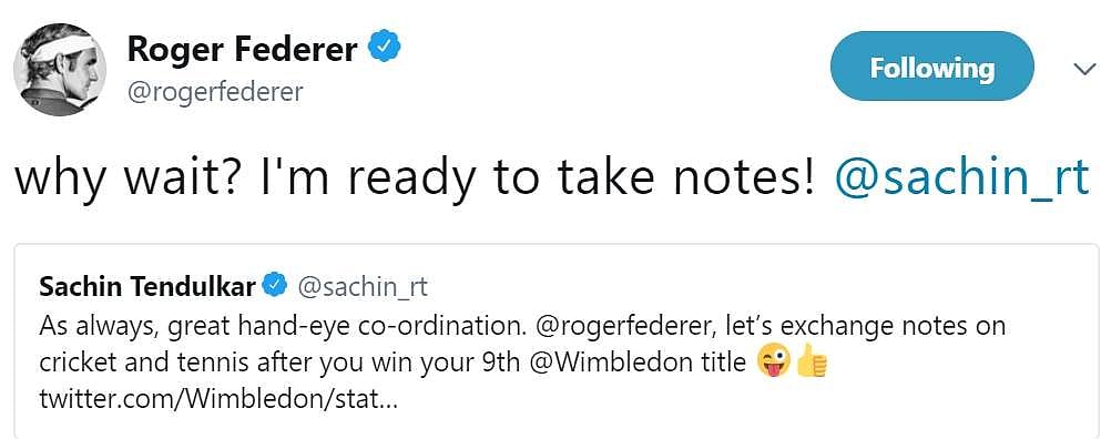 விம்பிள்டனில் தற்போது விளையாடி வரும் ஃபெடரர், ஓர் ஆட்டத்தில் கிரிக்கெட்டில் தற்காப்பு ஆட்டத்தை வெளிப்படுத்துவது போல ஒரு ஷாட்டை ஆடினார். இதையடுத்து இந்த விடியோவைக் கண்ட சச்சின், ஃபெடரருக்கு ட்வீட் செய்தார்.