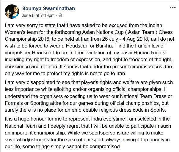 ஆசிய செஸ் போட்டி, ஜூலை 26 முதல் ஆகஸ்ட் 4 வரை ஈரானில் நடைபெறுகிறது. இதில் இந்திய அணி சார்பாக செளம்யா சுவாமிநாதனும் பங்குபெறுவதாக இருந்த நிலையில் திடீரென அவர் விலகியுள்ளார். இதுகுறித்த விளக்கத்தை ஃபேஸ்புக்கில் அவர் வெளியிட்டுள்ளார். அதில் அவர் கூறியதாவது: