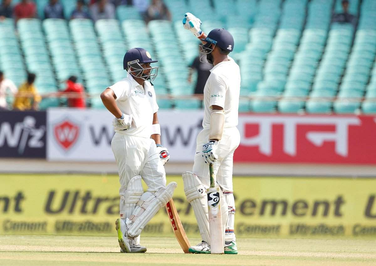 முதல் ஓவரின் கடைசிப் பந்திலேயே ராகுல் ரன் எதுவும் எடுக்காமல் ஆட்டமிழந்தார். தனது முதல் டெஸ்ட் போட்டியை விளையாடும் 18 வயது பிருத்வி ஷா அற்புதமாக விளையாடி ரசிகர்களை மகிழ்வித்து வருகிறார். 56 பந்துகளில் 7 பவுண்டரிகளுடன் அரை சதம் எடுத்து அசத்தினார்.
