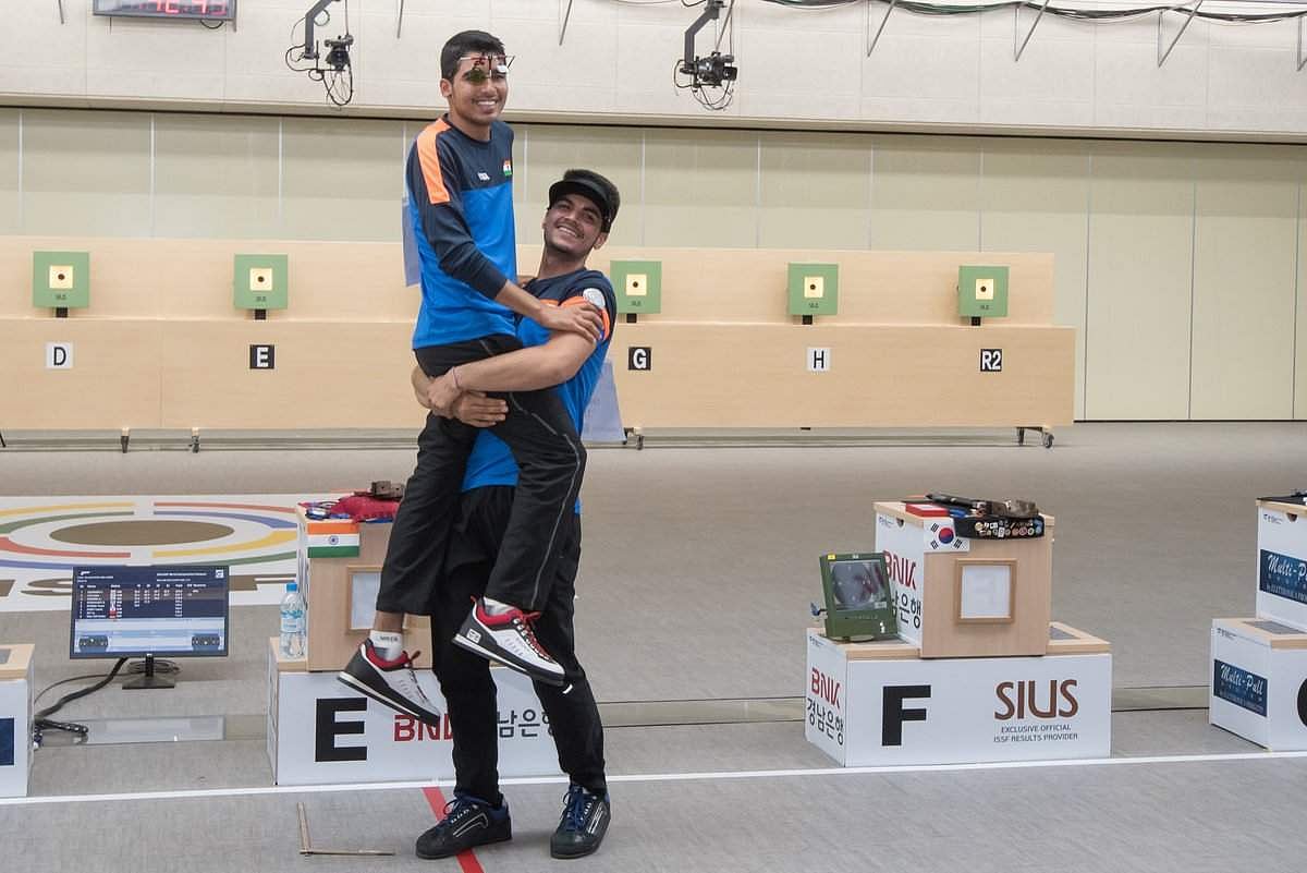 ஜூனியர் பிரிவின் 10 மீ. ஏர் பிஸ்டல் துப்பாக்கிச் சுடுதல் போட்டியில் 245.5 புள்ளிகள் பெற்று தங்கம் வென்றுள்ள செளரப் செளத்ரி, இதன்மூலம் புதிய ஜூனியர் உலக சாதனையையும் நிகழ்த்தியுள்ளார். இதே போட்டியில் இந்தியாவின் அர்ஜூன் சிங் சீமா வெண்கலம் வென்றுள்ளார்.