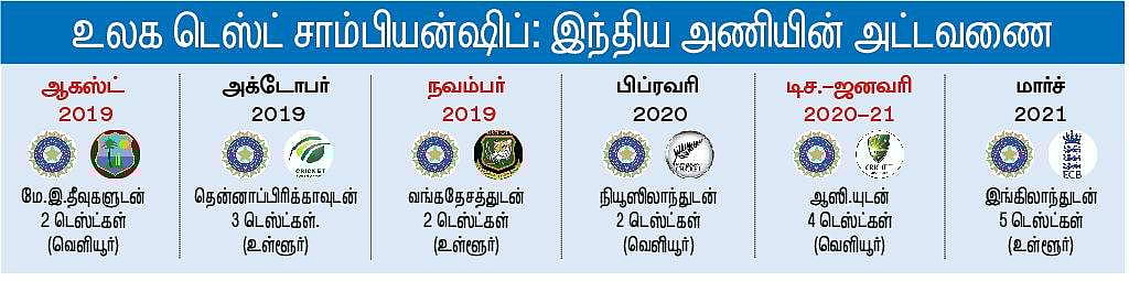 உலக டெஸ்ட் சாம்பியன்ஷிப் போட்டியின் துவக்க ஆட்டத்தில் ஆஷஸ் தொடரில் ஆஸி.-இங்கிலாந்து அணிகள் மோதுகின்றன. இந்திய அணி வரும் ஆக. 22-ஆம் தேதி தனது முதல் டெஸ்ட் ஆட்டத்தில் மே.இ.தீவுகளுடன் மோதுகிறது. 2 முதல் 5 ஆட்டங்கள் வரை ஒவ்வொரு தொடரில் இடம் பெறும். பகலிரவு டெஸ்ட்களும் நடக்கின்றன என்பது குறிப்பிடத்தக்கது.