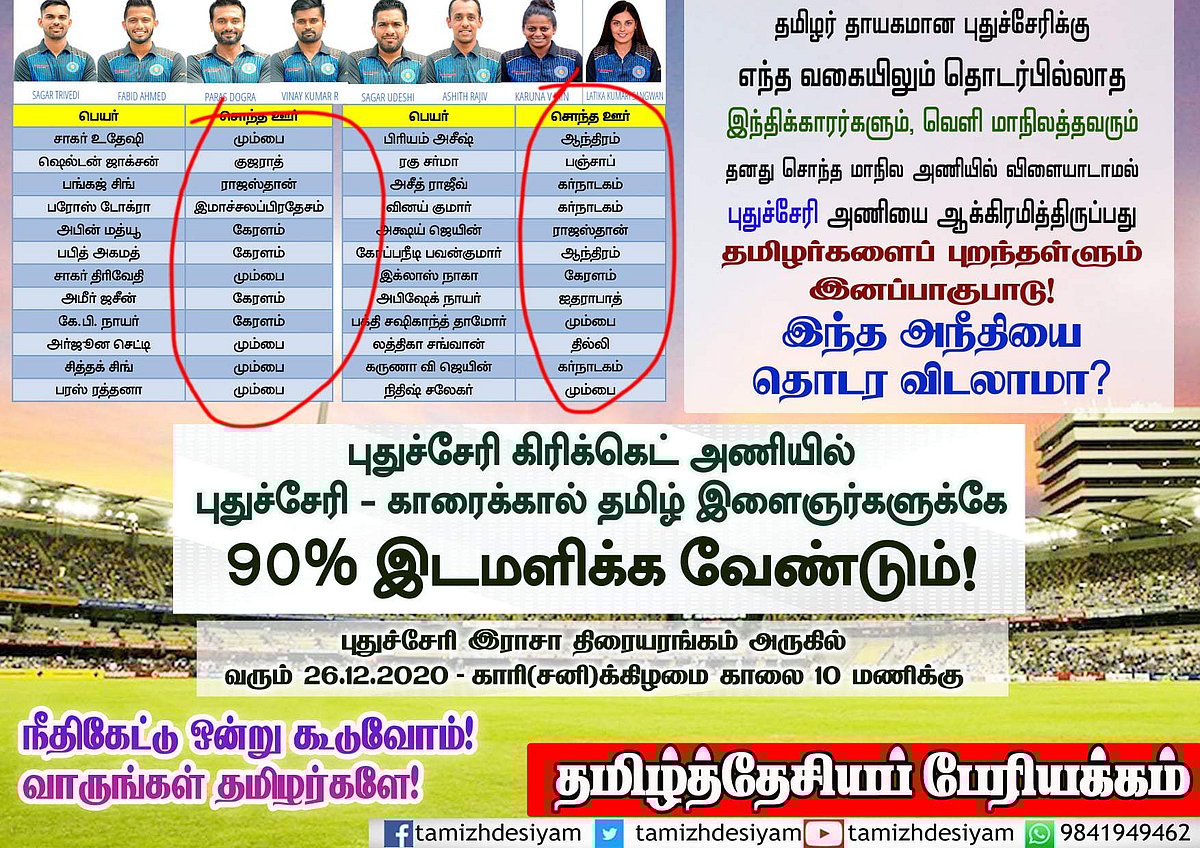 புதுச்சேரி கிரிக்கெட் அணியிலோ முழுக்க முழுக்க ஹிந்திக்காரர்கள் உள்ளிட்ட வெளி மாநிலத்தவர்களே...