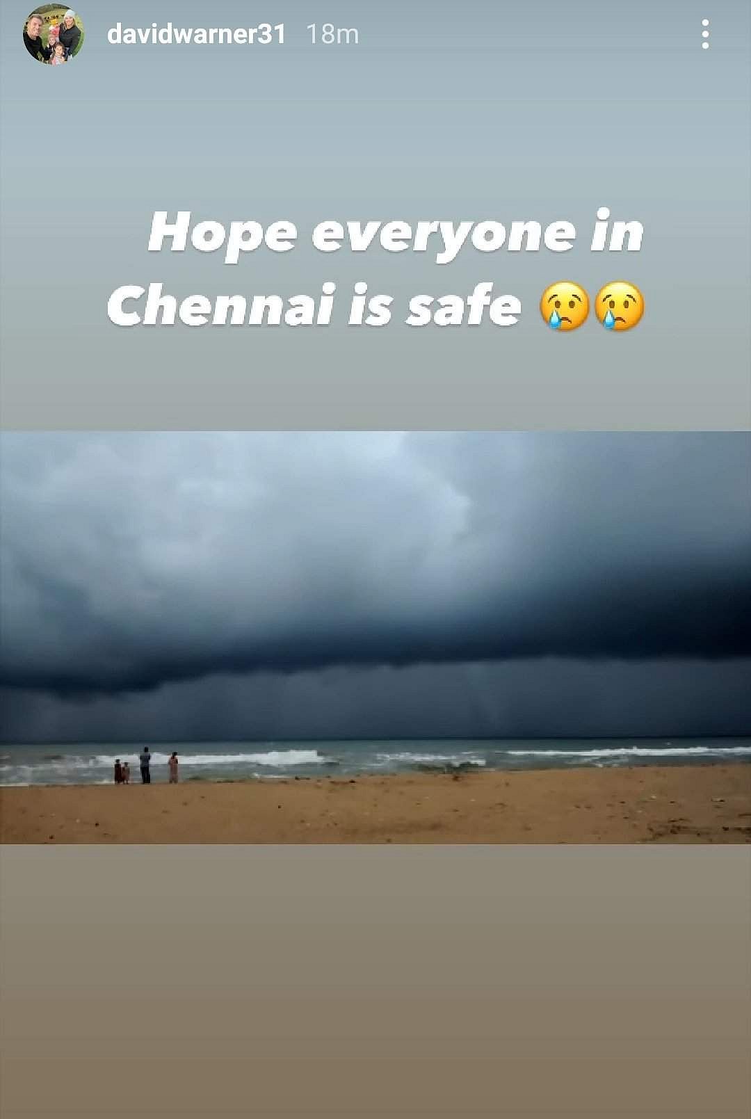 இந்நிலையில் நிவர் புயலின் நிலவரம் பற்றி அறிந்துள்ள ஆஸி. அணி பேட்ஸ்மேனும் சன்ரைசர்ஸ் ஹைதராபாத் ஐபிஎல் அணியின் கேப்டனுமான டேவிட் வார்னர், இன்ஸ்டகிராம் தளத்தில் அதுபற்றி எழுதியுள்ளார். சென்னையில் உள்ள அனைவரும் பாதுகாப்பாக இருப்பார்கள் என நம்புகிறேன் என்று எழுதியுள்ளார்.