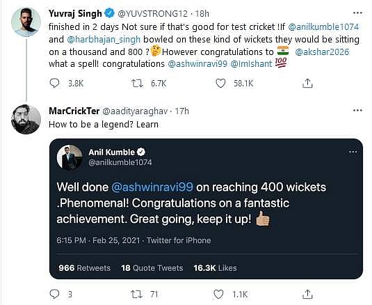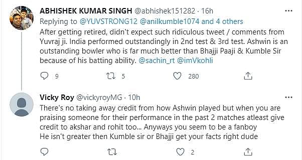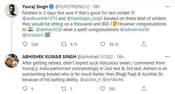 யுவ்ராஜ் சிங்கின் இந்தக் கருத்தை பல ரசிகர்கள் விரும்பவில்லை. ஆமதாபாத் ஆடுகளத்தை முன்வைத்து அஸ்வினின் சாதனையைக் குறைத்து மதிப்பிடுவதாக யுவ்ராஜ் சிங்கின் ட்வீட்டுக்கு பலரும் எதிர்ப்பு தெரிவித்துள்ளார்கள்.