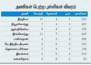 ஆஸ்திரேலிய அணி 8 வெற்றி, 4 தோல்வி, 2 டிராக்களுடன் 332 புள்ளிகளையும், இங்கிலாந்து 11வெற்றி, 7 தோல்வி, 3 டிராக்களுடன் 442 புள்ளிகளையும், பாகிஸ்தான் 4 வெற்றி, 5 தோல்வி, 3 டிராக்களுடன் 286 புள்ளிகளையும், மே.இந்திய தீவுகள் 3 வெற்றி, 6 தோல்வி, 2 டிராக்களுடன் 200 புள்ளிகளையும், தென்னாப்பிரிக்கா 3 வெற்றி, 8 தோல்வியுடன் 144 புள்ளிகளையும், இலங்கை 2 வெற்றி, 6 தோல்வி, 4 டிராக்களுடன் 200 புள்ளிகளையும் பெற்றன. வங்கதேச அணி 6 தோல்வி, 1 டிராவுடன் 20 புள்ளிகளை மட்டுமே பெற்று கடைசி இடத்தைப் பெற்றது.