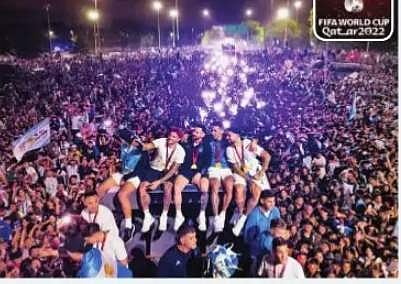 உலகக் கோப்பை கால்பந்து போட்டியில் 36 ஆண்டுகளுக்குப் பிறகு சாம்பியனாகி செவ்வாய்க்கிழமை நாடு திரும்பிய ஆா்ஜென்டீன கால்பந்து அணியினருக்கு அந்நாட்டு ரசிகா்கள் தலைநகா் பியூனஸ் அயா்ஸில் லட்சக் கணக்கில் கூடி உற்சாகக் கொண்டாட்டத்துடன் வரவேற்பளித்தனா். அணி வீரா்கள் சாம்பியன் கோப்பையுடன் திறந்த பேருந்தில் நின்றவாறு ஊா்வலமாக வந்தனா். இந்தக் கொண்டாட்டத்தில் பங்கேற்கும் வகையில் ஆா்ஜென்டீனாவுக்கு செவ்வாய்க்கிழமை அரசு விடுமுறை அளிக்கப்பட்டிருந்தது குறிப்பிடத்தக்கது.