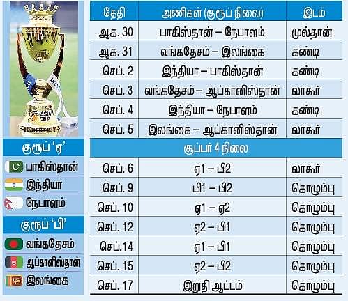 அந்தப் போட்டிக்கான அட்டவணையை ஆசிய கிரிக்கெட் கவுன்சில் புதன்கிழமை வெளியிட்டது. 6 அணிகள் களம் காணும் அந்த ஒரு நாள் போட்டி, ஆகஸ்ட் 30-இல் தொடங்கி செப்டம்பா் 17-இல் நிறைவடைகிறது.