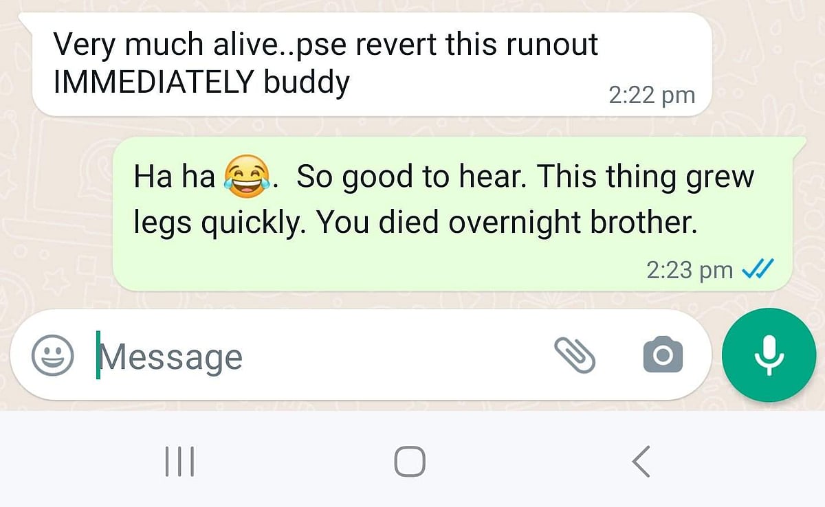 அந்த வாட்ஸ்அப் உரையாடலில், “நான் மிகவும் நலமாக இருக்கிறேன். ரன்அவுட்டை உடனடியாக திரும்பப் பெறுங்கள் நண்பா.” என்று ஹீத் விளையாட்டாக தெரிவித்திருந்தார்.