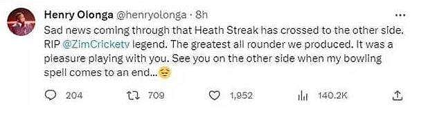 முன்னாள் ஜிம்பாப்வே வீரரும் ஹீத்தின் நண்பருமான ஹென்றி ஒலோங்காவும், ட்விட்டர் பக்கத்தில் இரங்கல் தெரிவித்து செய்தி வெளியிட்டிருந்தார்.