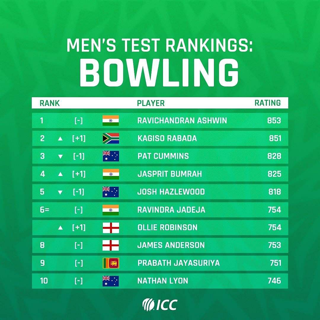 ஐசிசி டெஸ்ட் போட்டிக்கான தரவரிசை பட்டியல் வெளியிடப்பட்டுள்ளது. இந்த தரவரிசையில் பந்துவீச்சாளர்களுக்கான தரவரிசையில் இந்திய அணியின் நட்சத்திர சுழற்பந்துவீச்சாளர்களில் ஒருவரான ரவிச்சந்திரன் அஸ்வின் 853 ரேட்டிங் புள்ளிகளுடன் முதலிடத்தில் தொடர்கிறார். இந்திய அணியின் வேகப் பந்துவீச்சாளர் ஜஸ்பிரித் பும்ரா 4-வது இடத்தில் உள்ளார். இந்திய அணியின் மற்றொரு சுழற்பந்துவீச்சாளரான ரவீந்திர ஜடேஜா 6-வது இடத்தில் உள்ளார்.