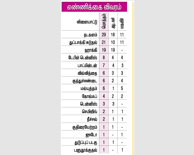 குறைந்தபட்சமாக குதிரையேற்றம், ஜூடோ, துடுப்புப் படகு, பளுதூக்குதல் ஆகியவற்றில் தலா 1 போட்டியாளா் களம் காண்கின்றனா்.