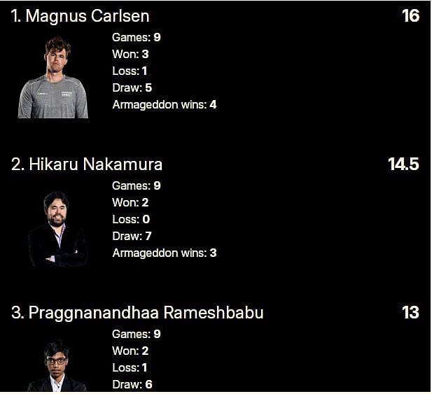 பிரக்ஞானந்தா முதலிடம் பிடிக்க கார்ல்சென், ஹிகரு நகமுரா இருவரும் தோற்க இவர் கிளாசிக்கல் கேமில் வெல்ல வேண்டும் என்பது குறிப்பிடத்தக்கது.