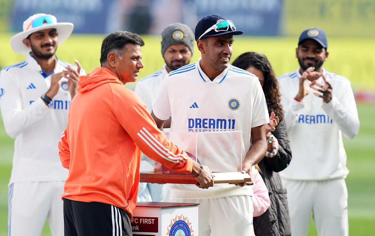 போட்டி துவங்குவதற்கு முன்னதாக அஸ்வினுக்கு நினைவுப் பரிசாக இந்திய அணியின் தொப்பி ராகுல் திராவிட்டால் வழங்கப்பட்டது. அவருடன் அவரது மனைவி, குழந்தைகளும் உடன் இருந்தார்கள். இந்தப் புகைப்படங்கள் வைரலாகி வருகிறன.