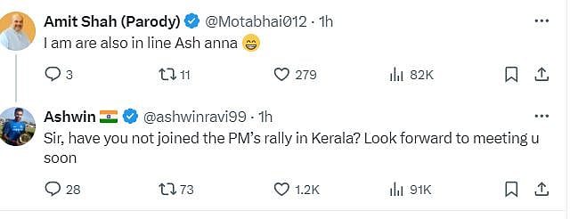 அதனைக் கண்ட அஸ்வின், “சார். கேரளத்தில் பிரதமர் மோடி பங்கேற்ற பேரணிக்கு நீங்கள் செல்லவில்லையா? நான் உங்களைச் சந்திக்க ஆவலாக இருக்கிறேன்.” எனக் கிண்டலடித்தார்.