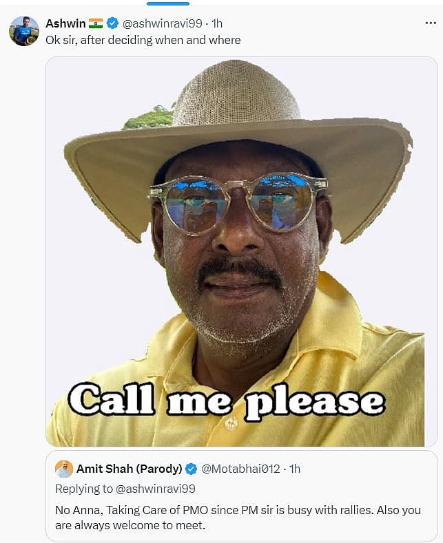 அஸ்வின், “ சரி சார். எங்கே, எப்போது என முடிவு செய்து என்னைத் தொடர்பு கொள்ளவும்” என பதிலளித்துள்ளார். நகைச்சுவைக்காக என்றாலும் அஸ்வின் பேசியது சுவாரஸ்யத்தை ஏற்படுத்தியுள்ளது.