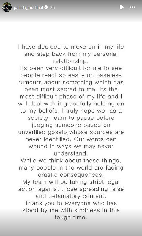 இதனைத் தொடர்ந்து பலாஷ் முச்சலும் அறிக்கை வெளியிட்டுள்ளார். அதில் அவர் தெரிவித்துள்ளதாவது,