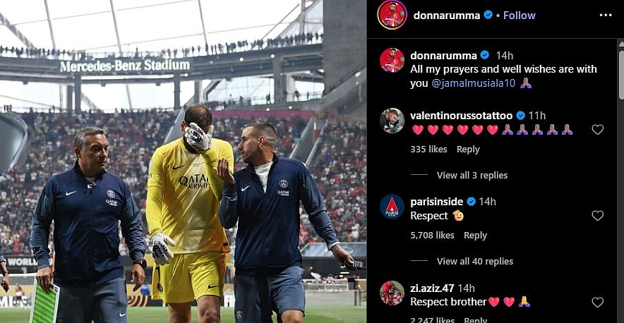 பிஎஸ்ஜி கோல் கீப்பர் டோனாரும்மா தனது இன்ஸ்டா பக்கத்தில் முசியாலாவை டேக் செய்து விரைவில் குணமாகி வரவேண்டும் என்ற வார்த்தைகளுடன் தான் வருத்தப்படும் புகைப்படத்தையும் பதிவிட்டுள்ளார்.