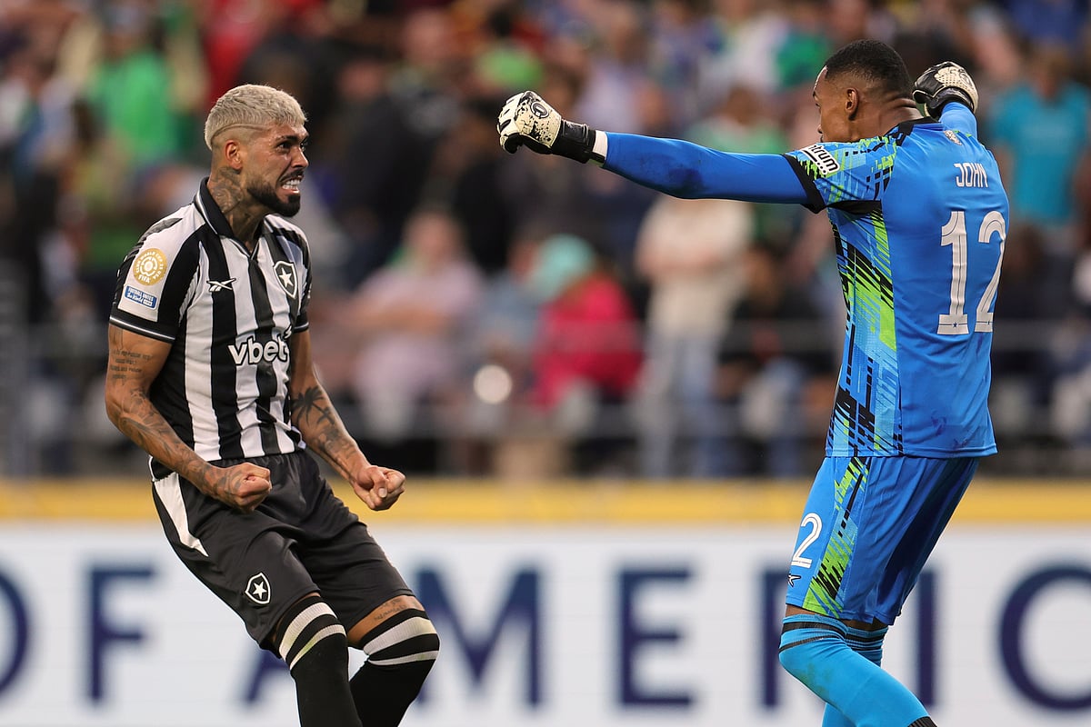 நடுவர் ட்ரூ பிஷ்ஷரிடம் கெஞ்சும் போடாஃபோகோ வீரர் அலெக்சாண்டர் பார்போசா.