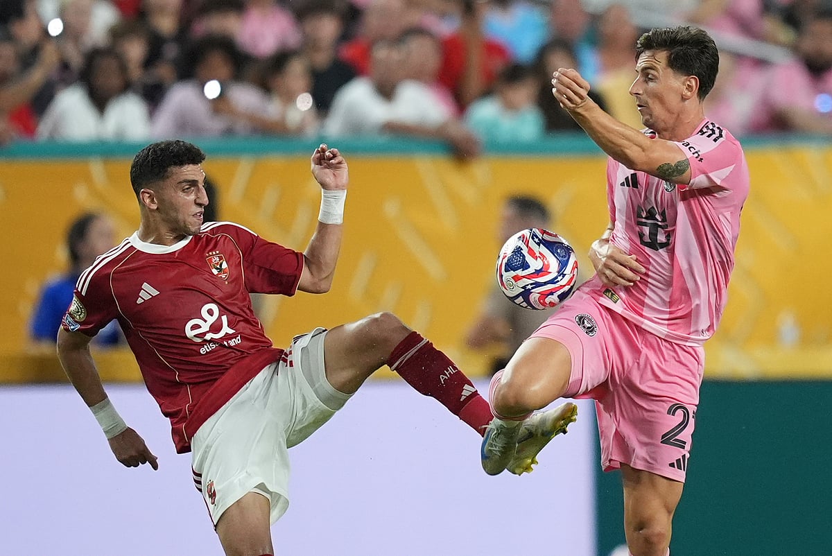 அல் அஹ்லி மற்றும் இன்டர் மியாமி இடையேயான போட்டிக்கு முன்னதாக, இன்டர் மியாமியின் லியோனல் மெஸ்ஸி(வலது) மற்றும் கோல்கீப்பர் ஆஸ்கார் உஸ்தாரி ஆகியோர் கோப்பையின் அருகில் உற்சாகமாக போஸ் கொடுத்தனர்.