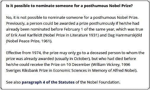 அதாவது, 1974ம் ஆண்டுக்குப் பிறகு, மறைந்த ஒருவரின் பெயர் நோபல் பரிசுக்கு பரிந்துரைக்கப்படுவது இல்லை. ஒரு வேளை, நோபல் பரிசு அறிவிக்கப்பட்டு, பரிசு வழங்கப்படுவதற்கு முன்பே, அவர் இறந்துவிட்டால் மட்டுமே, அந்த பரிசு அவரது பெயரில் வழங்கப்படும். அதுவும் நோபல் வரலாற்றில் ஒரே ஒரு முறை நடந்துள்ளது.