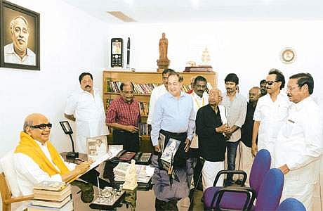 முரசொலி பவள விழாவை முன்னிட்டு சென்னை கோடம்பாக்கம் முரசொலி அலுவலகத்தில் வியாழக்கிழமை காலை நடைபெற்ற காட்சி அரங்க திறப்பு விழாவில் கருணாநிதியின் மெழுகு சிலையைப் பார்வையிடும் திமுக செயல் தலைவர் மு.க.ஸ்டாலின், திராவிடர் கழகத் தலைவர் கி.வீரமணி உள்ளிட்டோர்.