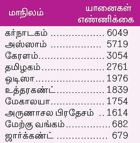 கர்நாடகம் முதலிடம்: தேசிய அளவில் அதிகபட்சமாக கர்நாடகத்தில் 6,049 யானைகளும், அடுத்ததாக, கேரளத்தில் 3, 054 மற்றும் தமிழகத்தில் 2,761 யானைகளும் உள்ளன. இதில், தமிழகத்தில் யானைகளின் எண்ணிக்கை வெகுவாக குறைந்துள்ளது. 2012 -ஆம் ஆண்டு கணக்கெடுப்பின்படி, தமிழகத்தில் 3, 500 யானைகள் இருந்தன. தேசிய அளவில் யானைகளின் எண்ணிக்கையில் கர்நாடகத்துக்கு அடுத்து அஸ்ஸாமில் 5,719 யானைகள் உள்ளன.