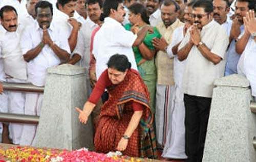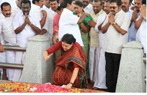 பெங்களூரு நீதிமன்றத்தில் சரண் அடைவதற்காக செல்லும் வழியில் ஜெயலலிதா நினைவிடம் சென்ற சசிகலா அங்கே அவரது சமாதியில் கையால் அடித்து சபதம் ஏற்றார்.