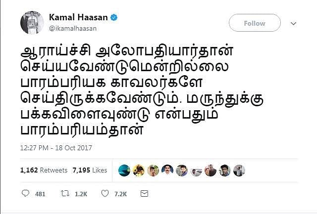 சரியான ஆராய்ச்சி முடிவுகள் கிடைக்கும் வரை நிலவேம்பு கஷாய விநியோகத்தில் ஈடுபட வேண்டாம் என்று தனது நற்பணி மன்ற ரசிகர்களுக்கு நடிகர் கமல் 'திடீர்' வேண்டுகோள் வைத்துள்ளார்.