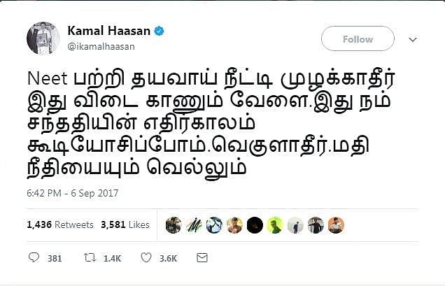 இந்நிலையில் நீட் விவகாரம் குறித்து நடிகர் கமல் தனது டிவிட்டர் பக்கத்தில் வெளியிட்டுள்ள ட்வீட் ஒன்றில்  ''நீட் பற்றி தயவாய் நீட்டி முழக்காதீர். இது விடை காணும் வேளை. இது நம் சந்ததியின் எதிர்காலம் கூடி யோசிப்போம்.வெகுளாதீர். மதி நீதியையும் வெல்லும்'' என்று தெரிவித்துள்ளார்.