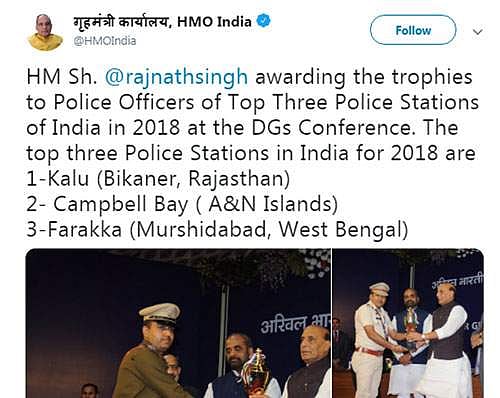 இது தொடர்பான பட்டியலை, தனது டுவிட்டர் பக்க பதிவில் உள்துறை அமைச்சர் ராஜ்நாத் சிங் வெளியிட்டுள்ளார். அந்த பட்டியலில், ராஜஸ்தான் மாநிலம் கலு காவல் நிலையம் முதல் இடத்தை பிடித்துள்ளது. இரண்டாவது இடத்தை அந்தமான் நிகோபார் தீவுகளில் உள்ள கேம்ப்பெல் பே காவல் நிலையமும், மூன்றாவது இடத்தை மேற்கு வங்கத்தில் உள்ள பரக்கா காவல் நிலையமும் பெற்றுள்ளது.