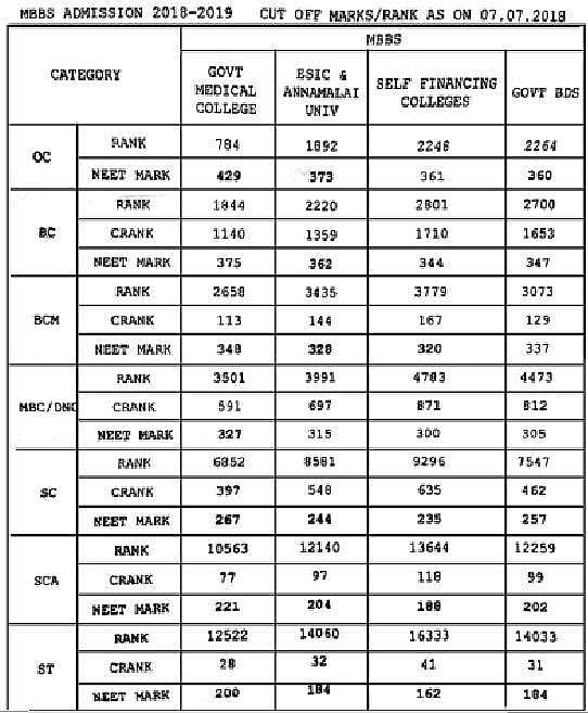 தமிழகத்தில் எம்.பி.பி.எஸ்.-பி.டி.எஸ். முதல் கட்ட கலந்தாய்வு நிறைவடைந்துள்ளதைத் தொடர்ந்து, நீட் தேர்வு மதிப்பெண் அடிப்படையில் கட்-ஆஃப் மதிப்பெண் வகுப்புவாரியாக வரையறுக்கப்பட்டுள்ளது.