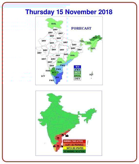 நவம்பர் 15ம் தேதி வட தமிழகம் மற்றும் புதுச்சேரியின் ஒரு சில இடங்களில் கன மழை முதல் மிகக் கன மழை பெய்யும் என்றும் அறிவுறுத்தப்பட்டுள்ளது.