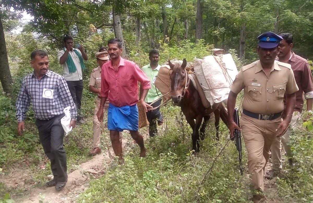 போடி அருகே உள்ள மலைக் கிராமத்திற்கு ஞாயிற்றுக் கிழமை குதிரை மூலம் வாக்குப் பெட்டிகள் கொண்டு செல்லப்பட்டன.