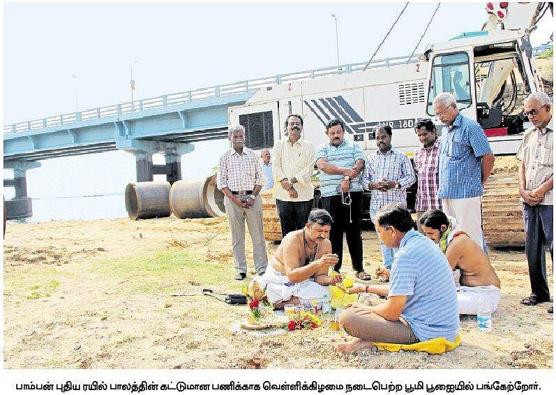 இதையடுத்து பூமி பூஜை வெள்ளிக்கிழமை போடப்பட்டு சனிக்கிழமை முதல் புதிய பாலத்தின் தூண்கள் அமைக்கும் பணிகள் நடைபெற்று வருகின்றன. இனிவரும் காலங்களில் புதிய பாலத்தின் வழியாக ரயில்களை அதிவிரைவாக, அதிக எடையை தாங்கக் கூடியதால் பாம்பன் - ராமேஸ்வரம் இடையே அதிக ரயில் போக்குவரத்துடன் இயக்க முடியும் என்று தெரிவித்தார்.