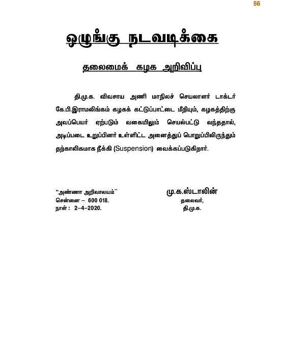 திமுகவின் அடிப்படை உறுப்பினர் உள்ளிட்ட அனைத்துப் பொறுப்புகளில் இருந்தும் கே.பி.ராமலிங்கம் நீக்கம் செய்யப்படுவதாக திமுக தலைவர் மு.க.ஸ்டாலின் அறிவித்துள்ளார்.
