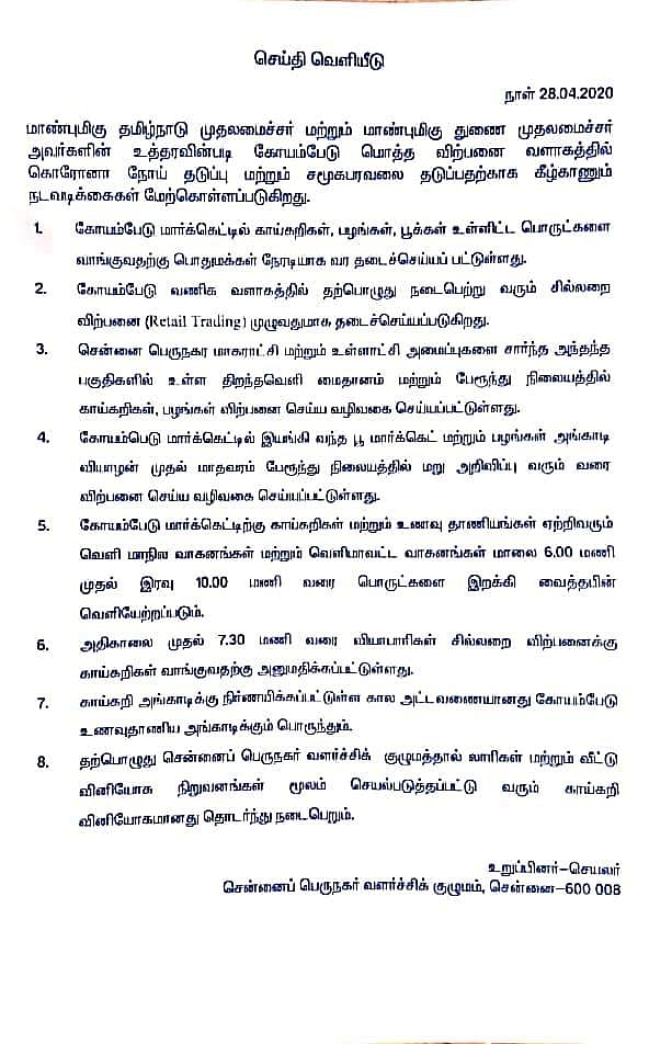 காய்கறிக் கடைகள் வழக்கம்போல் கோயம்பேட்டில் செயல்படும். ஆனால், கோயம்பேடு சந்தையில் மொத்த விற்பனை மட்டுமே நடைபெறும். அதிகாலை முதல் காலை 7.30 மணி வரை மட்டுமே வியாபாரிகள் காய்கறிகள் வாங்க அனுமதிக்கப்படுவர். பொதுமக்கள் வருவதற்கு(சில்லறை விற்பனை) முழுமையாகத் தடை விதிக்கப்படுகிறது.