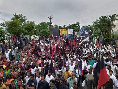 திருப்பூர் ரயில் நிலையம் முன்பாக கருப்புக்கொடி ஆர்ப்பாட்டத்தில் ஈடுபட்ட திமுகவினர்.