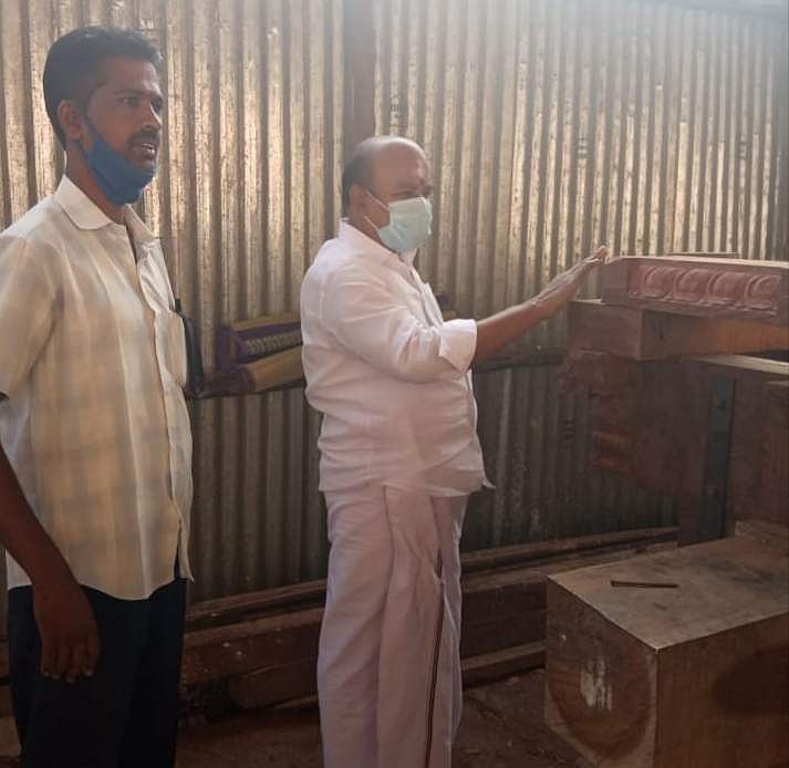 தமிழக துணை சபாநாயகர் பொள்ளாச்சி ஜெயராமன் ஸ்ரீவாஞ்சியம் கோயில் தேர் கட்டுமானப் பணிகளை பார்வையிட்டார்.