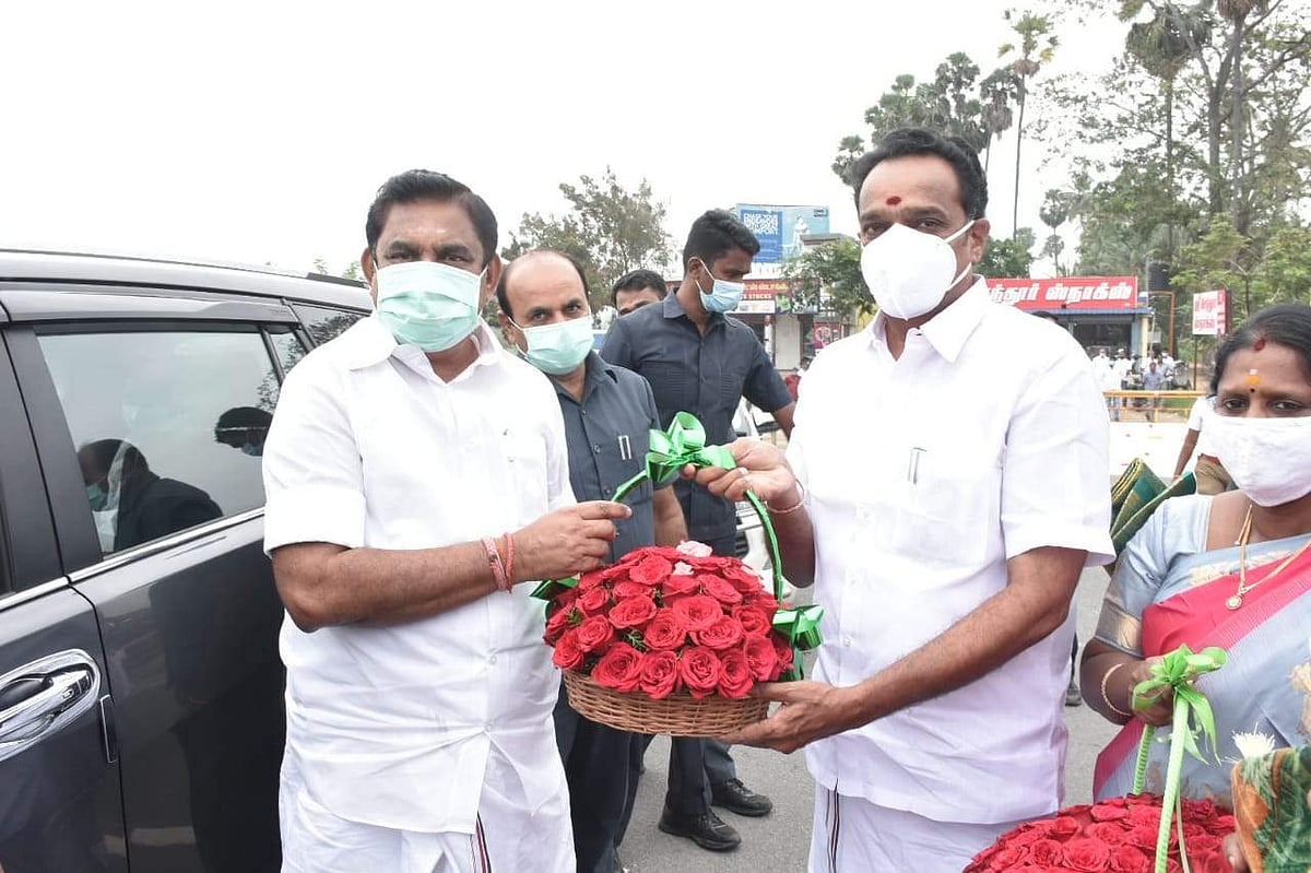 முன்னதாக சேலத்தில் இருந்து கரூர் மாவட்டத்திற்கு வந்த முதல்வருக்கு மாவட்ட எல்லையான தவுட்டுப்பாளையத்தில் போக்குவரத்துத் துறை அமைச்சர் எம்.ஆர். விஜயபாஸ்கர் தலைமையில் உற்சாக வரவேற்பு அளிக்கப்பட்டது.
