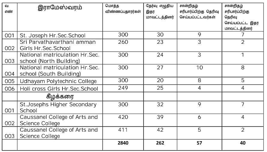1. இராமநாதபுரம் மாவட்டத்தில் 8 வட்டங்களில் 128 தேர்வு மையங்களில் 32,879 விண்ணப்பதாரர்களுக்கு தேர்வு நடைபெற்றது. இதிலிருந்து 497 விண்ணப்பதாரர்கள் சான்றிதழ் சரிபார்ப்புக்காக அனுமதிக்கப்பட்டுள்ளனர். இராமேஸ்வரம் மற்றும் கீழக்கரை வட்டங்களில் பல்வேறு தேர்வுக்கூடங்களில் தேர்வு எழுதிய விண்ணப்பதாரர்களின் விவரங்கள் பின்வருமாறு: