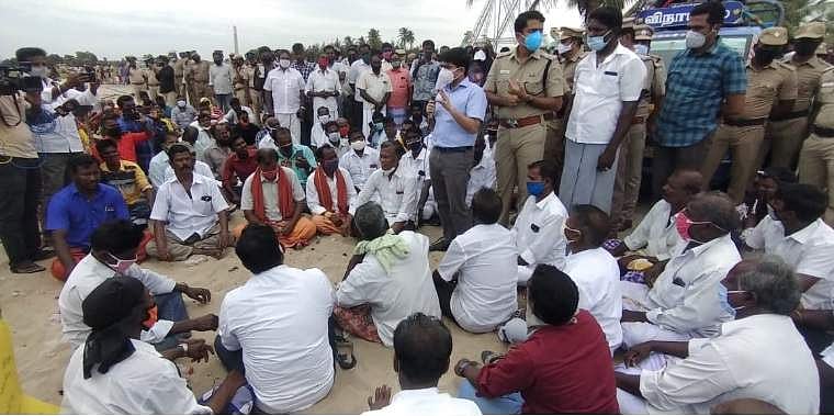 சிதம்பரம் அருகே சாமியார்பேட்டை கிராமத்தில் 2 ஆயிரம் மீனவர்கள் ஒன்று திரண்டு கருப்புக் கொடியுடன் தர்ணா போராட்டத்தில் வெள்ளிக்கிழமை ஈடுபட்டனர்.