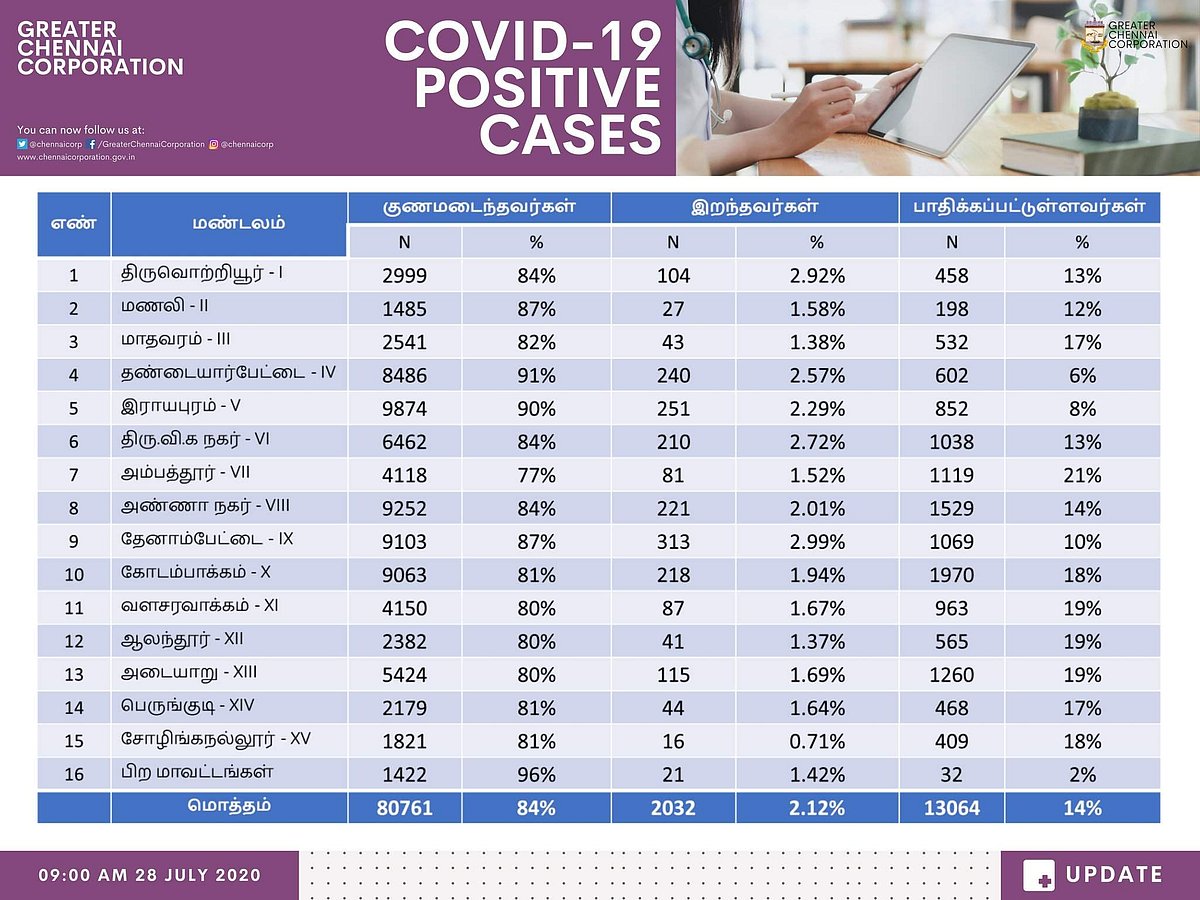 சென்னையில் உள்ள 15 மண்டலங்களில் கரோனாவுக்கு சிகிச்சை பெறுவோரின் எண்ணிக்கையில் அதிகபட்சமாக அம்பத்தூரில் 21% நோயாளிகளும், தண்டையார்பேட்டை 6%, ராயபுரத்தில் 8% ஆகவும் உள்ளது.