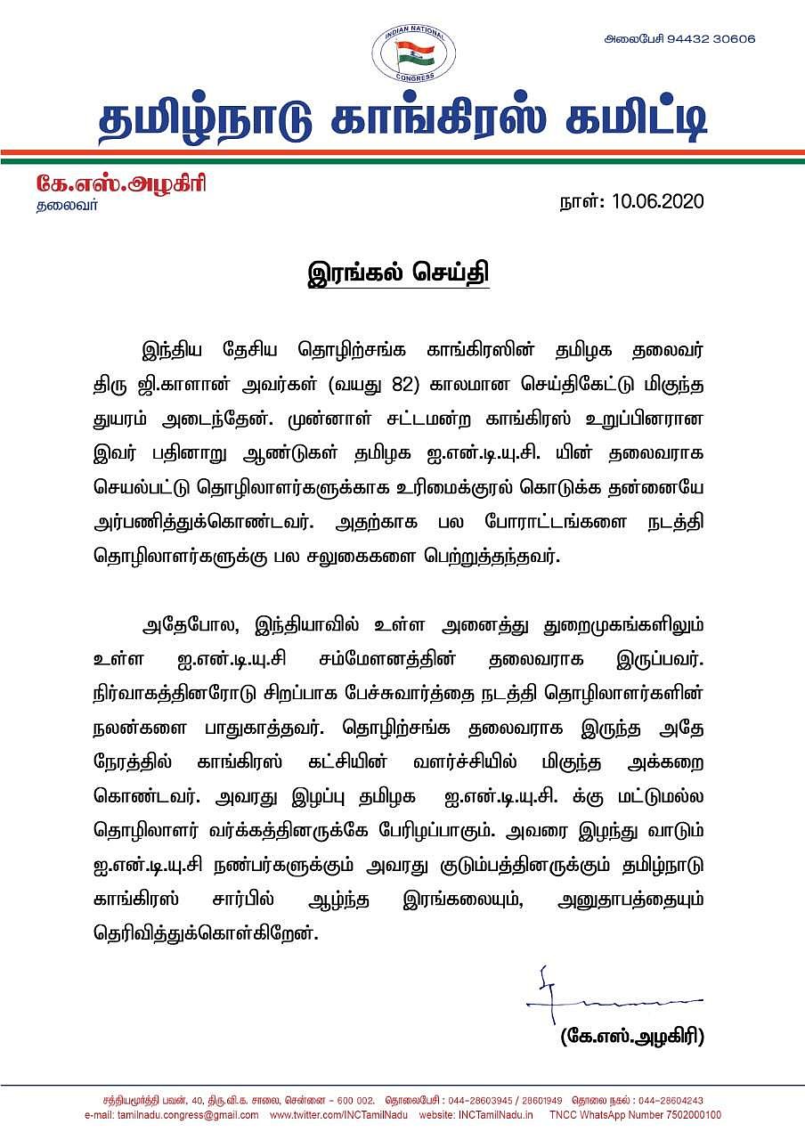 இந்திய தேசிய தொழிற்சங்க காங்கிரஸின் தமிழக தலைவர் திரு ஜி.காளன் அவர்கள் காலமான செய்திகேட்டு மிகுந்த துயரம் அடைந்தேன். முன்னாள் சட்டமன்ற காங்கிரஸ் உறுப்பினரான இவர் பதினாறு ஆண்டுகள் தமிழக ஐ.என்.டி.யு.சி.யின் தலைவராக செயல்பட்டு தொழிலாளர்களுக்காக உரிமைக்குரல் கொடுக்க தன்னையே அர்பணித்துக்கொண்டவர். அதற்காக பல போராட்டங்களை நடத்தி தொழிலாளர்களுக்கு பல சலுகைகளை பெற்றுத் தந்தவர்.