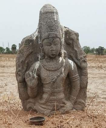 இக்கிணற்றில் இருந்து மேற்கு திசையில் 150 அடி தொலைவில் மிக அழகிய 10ஆம் நூற்றாண்டைச் சார்ந்த விஷ்ணு சிற்பம் இடுப்புக்குக் கீழே மண்ணில் புதையுண்ட நிலையில் இடுப்பிலிருந்து மேல்பாகம் வரை காண முடிகிறது. அழகிய புடைப்புச் சிற்பமாக மேலிரு கரங்களில் சங்கு சக்கரம் ஏந்தி, வலது கரத்தில் அபயம் காட்டி, இடது கரத்தை இடுப்பில் ஊன்றியவாறு காணப்படுகிறது. இவரின் காது, கழுத்து, கை, இடுப்பு என அனைத்திலும் அணிகலன்கள் திகழ காணப்படுகிறார்.